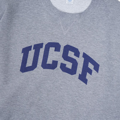 落ち着いたトーンのグレーボディに、ネイビーカラーでUCSF(カリフォルニアユニバーシティー サンフランシスコ)とプリントしたクルーネックスウェット。